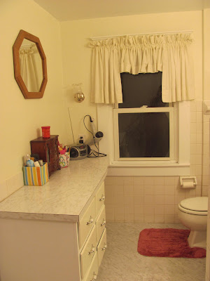 Here you can see what the bathroom looked like when we bought the house back in 1995. This is the first room I wallpapered! lol
